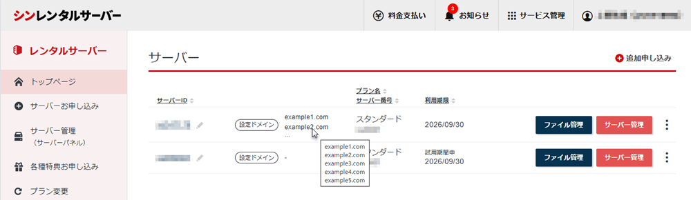一覧画面では最大2件のドメインが表示され、
