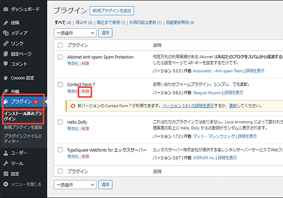 WordPress管理画面を開き、左メニュー「プラグイン」-「インストール済みプラグイン」をクリックしてください。