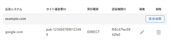 入力した情報が一覧に表示されましたら、ads.txtの追加は完了です。
